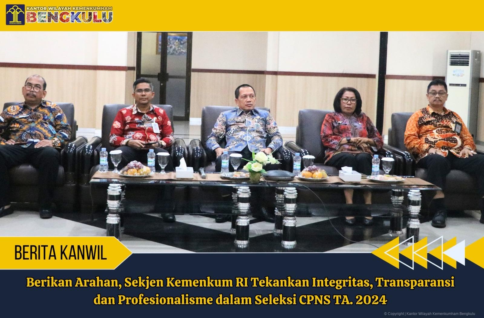 Sekjen Kemenkum dalam arahannya mengevaluasi kembali pelaksanaan Seleksi CPNS TA 2024, beliau berpesan untuk terus menjunjung tinggi integritas, transparansi dan profesionalisme dalam setiap tahapan pelaksanaan mengingat masih ada agenda tes wawancara dan SKB CAT yang akan datang. Sekjen Kemenkum juga menyampaikan pesan Menteri Hukum ”Pastikan bahwa recruitment PNS berjalan sesuai dengan mekanisme yang ditentukan, dan pada tahap wawancara untuk menggali secara mendalam baik prestasi akademik/non akademik, pengalaman organisasi agar mendapat calon yang terbaik dari yang terbaik” pungkasnya.