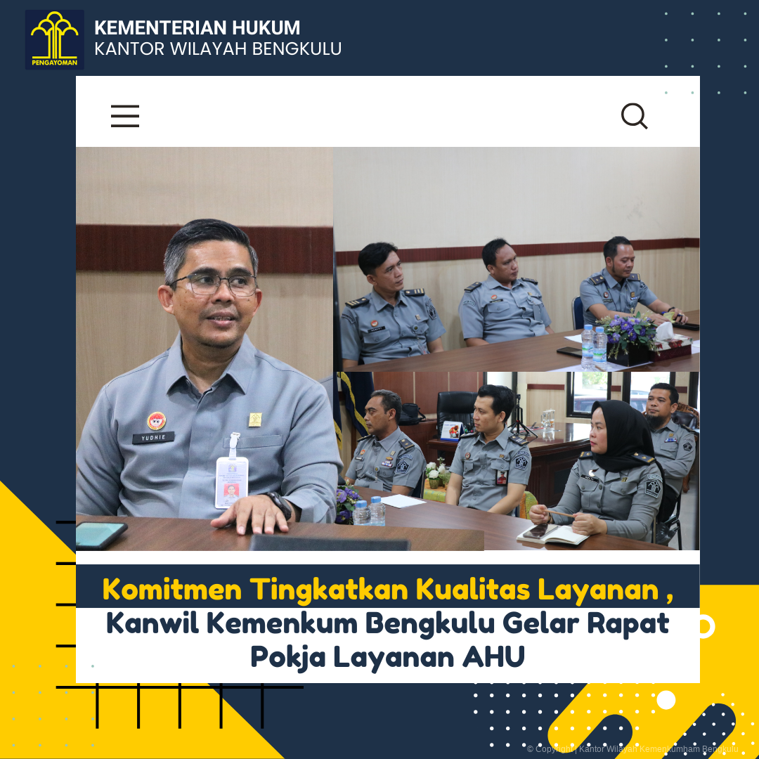 Bengkulu - Kantor Wilayah Kementerian Hukum Bengkulu, melaksanakan rapat teknis kelompok kerja Administrasi Hukum Umum dalam rangka membahas perkembangan dan strategi pelaksanaan kegiatan AHU untuk tahun 2025. Beberapa topik penting yang dibahas termasuk evaluasi layanan yang ada, perencanaan kegiatan AHU, serta pengelolaan dan penyelesaian bidang AHU. Dipimpin langsung oleh Kadivyankum Bengkulu, Machyudhie, bersama Kabid Pelayanan AHU, Pande Made Handika Riady dan dihadiri kelompok kerja AHU, Selasa (25/2/2025).
